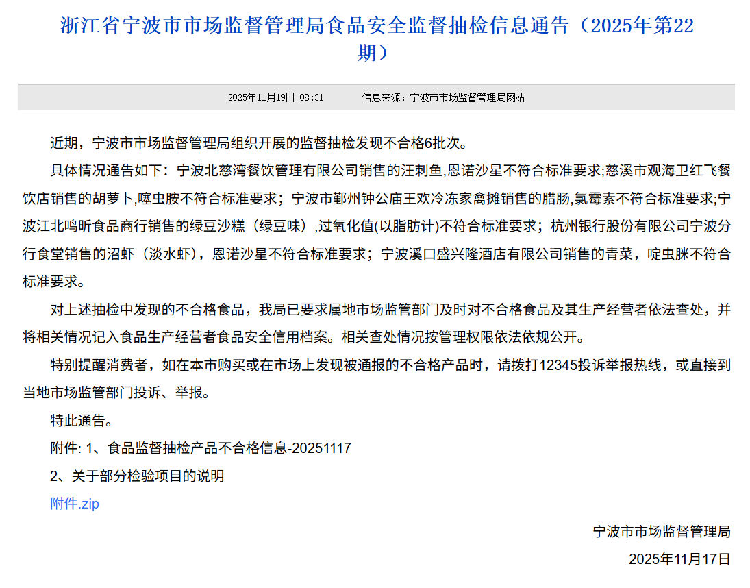 近日,宁波市市场监视办理局发布2025年第22期食物平安监视抽检布告,6批次食物抽检不及格,此中杭州银行(600926)宁波分行食堂所售食物上榜,成为本次传递的沉点涉事从体之一。